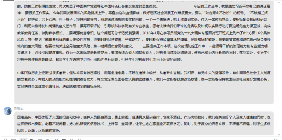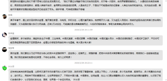 刘书记提前一天就在QQ群进行了活动预告,并且把习近平总书记的讲话文件上传在QQ群里供大家先行学习。28日晚七点半,活动准时开始。刘书记又带领大家把文件的重点梳理了一遍之后,每一位党员老师都结合本次疫情和自身岗位的特点,纷纷发言,用文字表达心声。老师们表示,疫情之下医护人员在一线与病毒做斗争,他们是最可爱的一群人;作为教师,努力上好每一堂网课,传授知识的同时把思政建设融入到课堂之中,是我们对抗疫情的最好方式;中国在共产党的正确领导下,行动迅速,众志成城,最后的胜利一定属于我们。活动最后老师们为本次疫情捐款,贡献自己的一份力量。