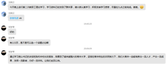 4月30日,为了深入学习领会习近平总书记关于坚持和完善中国特色社会主义制度,推进国家治理体系和治理能力现代化的重要论述,聚焦主业,聚焦发展,有效落实“执行力提升年”的各项措施,beat365手机版官网入口大学英语第二教研室全体教职工在党支部书记刘晓云的主持下,学习文件,积极讨论,在QQ群里开展了本学期第二次教职工理论学习活动。