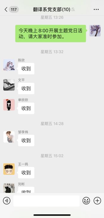 根据公司的统一安排部署,翻译系党支部于5月8日在微信群开展了以“疫情防控践初心、严峻斗争担使命”为主题的线上主题党日活动,翻译系全体党员参加了本次活动。首先,大家深入学习了习近平总书记关于统筹推进疫情防控和经济社会发展的重要讲话精神,以及中央和省委全面推进复工复产、扩大消费发展经济的政策措施。然后,大家结合实际进行了热烈的讨论。大家一致表示,要在疫情防控和经济社会发展中积极发挥“六个带头”作用,认真做好疫情防控工作、线上教学工作、以及开学前的各项准备工作。