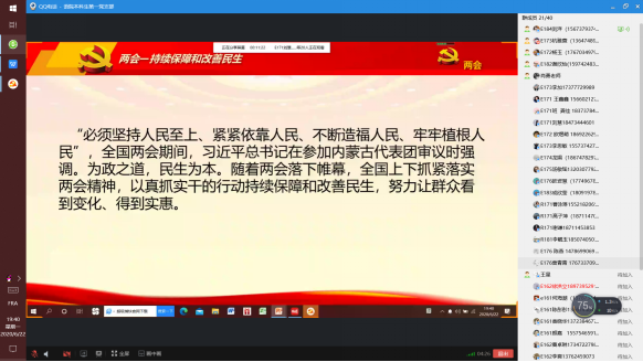首先,刘洋同志宣读会议流程,并邀请支部书记肖勇讲话。肖勇首先发表此次两会的个人感悟,指出“六稳”“六保”工作的实施意义和必要性,强调今年是决胜脱贫攻坚战的收官之年,也是实现全面建成小康社会的一年,我们有决心更有信心。随后党员代表刘慧,龙娟等同学表示在认真学习2020两会和政府工作报告中,深刻感受到了在党中央的领导下,人民的生活品质都有了很大的提升和保障。相信在党的领导下一定能克服万难,开拓进取!