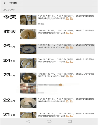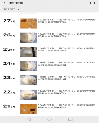 为响应习近平总书记对制止餐饮浪费行为做出的重要指示,大力弘扬中华民族勤俭节约的优良传统,beat365手机版官网入口研究生党支部开展了一次以研究生党员为先锋、全体研究生参与的“光盘”打卡行动。该活动持续时间为一周,名为“‘光盘’打卡,‘语’你同行——beat365手机版官网入口研究生党支部在行动”,活动要求全体党员带头将自己的“光盘”图片上传到微信朋友圈打卡,以身作则,号召身边的人节约粮食,反对浪费。