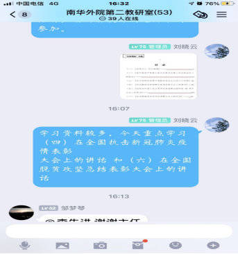 本次专题会议重点学习《在全国抗击新冠肺炎疫情表彰大会上的讲话》和《在全国脱贫攻坚总结表彰大会上的讲话》。参会教师在自学群内上传的学习资料之后,纷纷发表学习心得。大家表示,“彩虹和风雨共生,机遇和挑战并存”,全国人民要继续打好抗疫常态化战争,为实现全民小康、全面脱贫而奋斗;同时,党和政府把人民的生命健康放在首位,改善贫困人口生活,提高全民生活水平,体现了为全体中国人谋福祉的共产党人的责任心。
