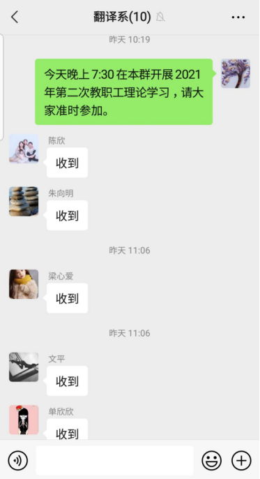 4月29日,翻译系在微信群开展了2021年第二次教职工理论学习,本次学习的主题是学史增信。首先,大家认真学习了习近平总书记在党史学习教育动员大会上的讲话、习近平总书记关于努力成为世界主要科学中心和创新高地的讲话、习近平总书记在福建考察时的讲话、《关于在党史学习教育中加强集体学习和规范自学的通知》、《“学史增信”要从九个方面“增信”》以及扎扎实实抓好党员干部党史学习教育、准确把握“学史增信”的目标要求、在学史增信中坚定信念等理论文章。通过“学史增信”专题学习,有利于使大家把新民主主义革命时期历史、社会主义革命和建设时期历史、改革开放新时期历史、党的十八大以来的历史贯通起来,不断增强中国特色社会主义道路自信、理论自信、制度自信、文化自信,进一步坚定对马克思主义的信仰,对中国特色社会主义的信念,对以习近平同志为核心的党中央的信赖,对实现中华民族伟大复兴中国梦和建设现代化新湖南的信心。
