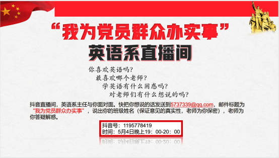 5月4日晚,英语系“我为党员群众办实事”活动通过抖音直播间的方式顺利开播。英语系主任、党支部书记卢佳在直播间为公司师生进行了长达一个小时的直播,与师生面对面答疑解惑。