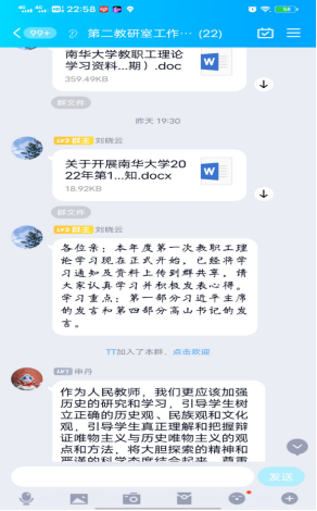4月12日晚,大学英语第二教研室在腾讯QQ群平台开展了2022年第一次教职工理论学习研讨会。会议由支部书记刘晓云主持,第二教研室全体教师参与了学习讨论。
