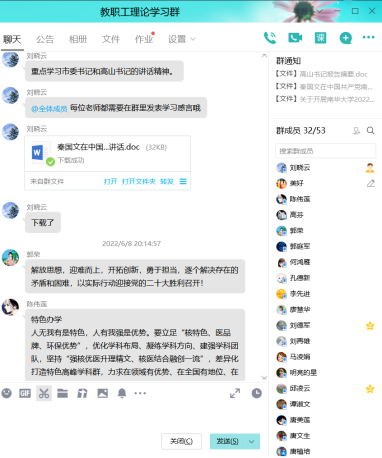 6月8日晚,beat365手机版官网入口大学英语第一教研室、大学英语第二教研室以及研究生英语教研室三个公共外语教研室通过腾讯QQ群开展了2022年第三次教职工理论学习。学习研讨会由教师第二党支部书记刘晓云主持,三个教研室的全体教师参与了学习讨论。