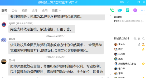 7月1日晚,教师第三党支部在支部QQ群开展2022年第三次全体教职工理论学习。本次理论学习由党支部书记王东山主持。理论学习的主题是深入学习领会习近平总书记关于民主法治和全过程人民民主的重要论述,深入实施公司“八五”普法规划,持续推进依法治校,大力推进公司治理体系和治理能力现代化。