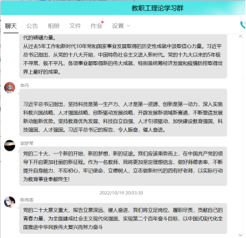 10月19日晚,beat365手机版官网入口教师第二党支部通过QQ群开展了2022年第六次教职工理论学习会,会议由党支部书记刘晓云主持,支部所辖全体教师参与了会议与讨论。