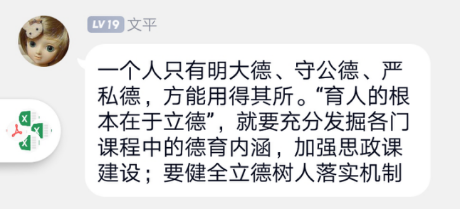 最后,老师们就学习内容展开讨论,交流学习心得。纷纷表示,我们每一个教育工作者要牢记职责使命,坚持把立德树人作为根本任务,努力提升人才培养质量,致力于培养德智体美劳全面发展的社会主义建设者和接班人。