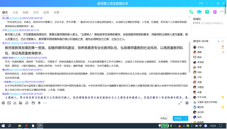 5月28日晚上,教师第三党支部于腾讯线上会议室开展2023年第三次教职工理论学习。理论学习由党支部书记王东山主持,学习主题围绕党的二十大报告精神展开,全面学习贯彻习近平总书记关于中国式现代化、推动高质量发展、扎实推进共同富裕的重要论述,努力办好人民满意的教育。
