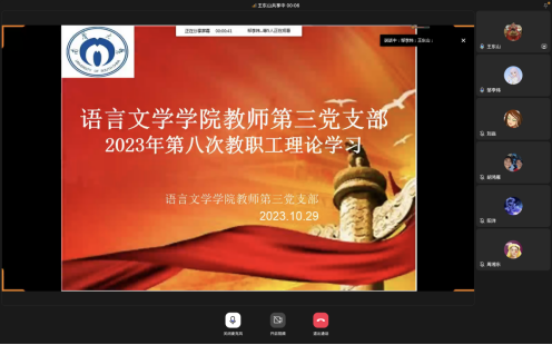 10月29日晚上,beat365手机版官网入口教师第三党支部于腾讯线上会议室开展第八次教职工理论学习。理论学习由党支部书记王东山主持。此次理论学习主题是“深入学习领会习近平文化思想、习近平总书记重要指示和全国宣传思想文化工作会议精神,全面贯彻党的二十大关于文化建设的战略部署,始终坚持党管宣传、党管媒体、党管意识形态,以新气象新作为不断推动公司宣传思想文化工作高质量发展取得新成效。”