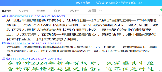 全体教师深受鼓舞,在交流环节中畅所欲言,对于未来充满了信心与期待。胡大伟老师说:“习近平主席的新年贺词让我们进一步了解了国家过去一年取得的成就,了解2024年的美好蓝图。新年致辞温暖人心,催人奋进,激励亿万人民把光荣和梦想书写在强国建设、民族复兴伟业的新征程上。大家在新的一年里要坚定信心,勇毅前行,把中国式现代化宏伟蓝图一步步变成美好现实。”