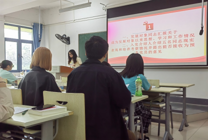 会议首先由5名发展对象同志依次做汇报,以及入党介绍人介绍发展对象有关情况,并对其能否入党,本人是否同意加入党组织表明意见。再由党支部支委苏柯睿代表支部委员会介绍5名同志成为发展对象期间的教育考察情况,并提出能否接收为预备党员的意见。胡刘俊、雷嘉琦、王沭、丁玲、肖邦共5名同志,自成为入党积极分子以来,在政治上能与党中央保持一致,能认真贯彻党的路线、方针和政策,对党有一定的认识,入党动机端正,入党目的明确,热爱党,热爱社会主义制度,拥护党的基本路线和党的各项方针政策,积极要求进步,靠拢党组织。在考察期间能以党员标准规范自己的言行,工作认真负责,积极主动,任劳任怨,表现突出。党支部分别召开了党内外群众座谈会,大家一致认为该5名同志工作认真负责,能起模范带头作用,工作完成较好,在群众中有较好威信,符合预备党员接收条件。