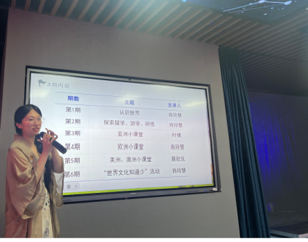 活动伊始,肖玲慧通过猜国旗游戏引入了世界各国的文化特色与历史背景。接着她介绍了海外华人生活,并以亲身经历着重讲述了德国华人在文化节上对汉服文化的展示。随后她分享了许多实用的有关留学的信息与建议,并更加深入讲解和分析了境外公司的教学理念与课程设置,为有需求的同学提供了详实的参考信息。最后,她从跨文化、国际赛事与校际合作等方面介绍了可供选择渠道,解读了每种方式的特色与优势,帮助大家更好匹配适合自己的留学计划。
