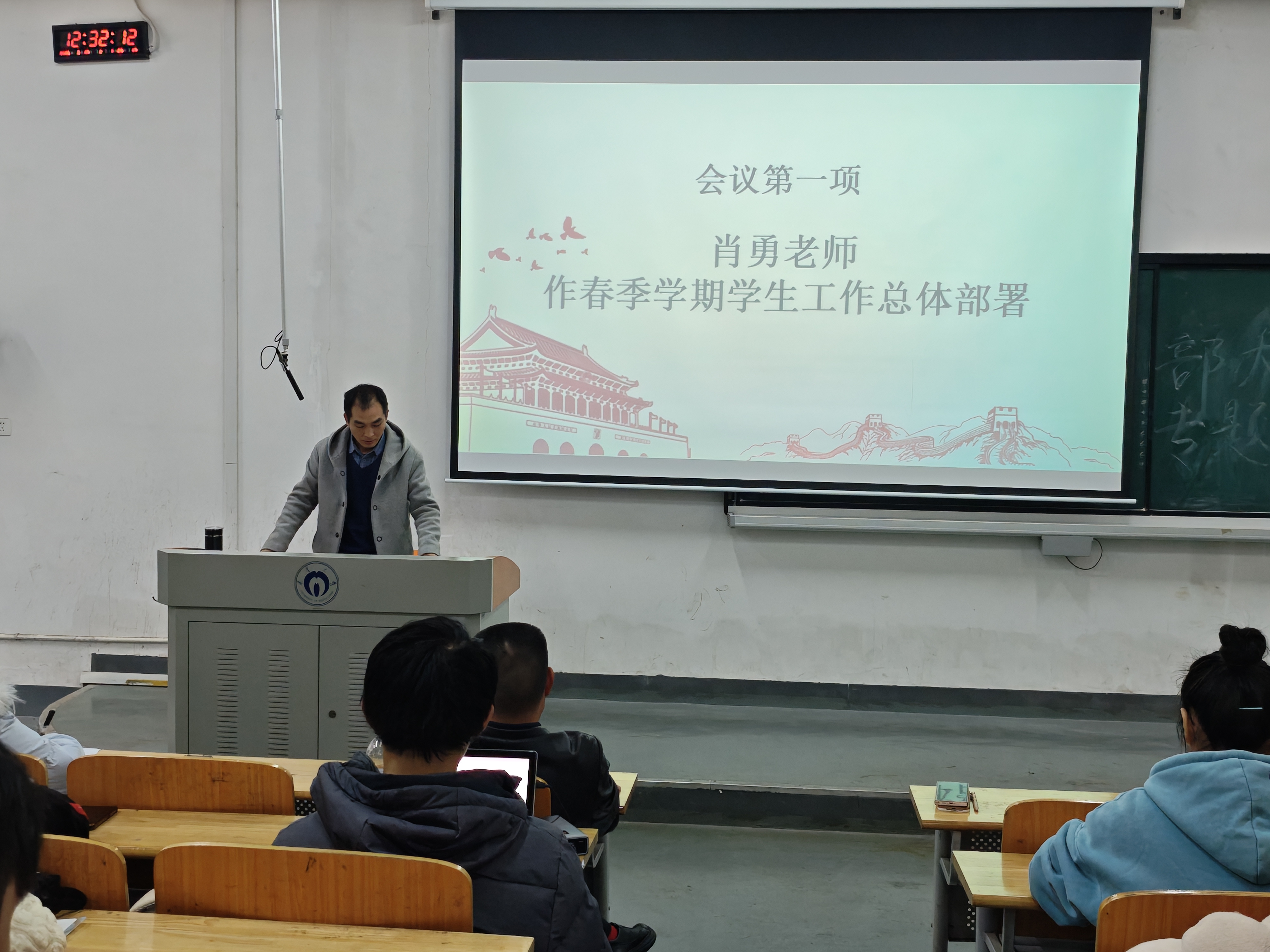会议伊始,学工室主任肖勇围绕新学期员工工作进行总体安排,部署本学期重点任务与工作节奏,进一步细化责任分工,为新学期团学工作有序开展划定清晰方向。辅导员王冰灵结合学风建设、日常管理与劳动教育作出具体部署,引导全体员工强化自律意识,端正学习态度,在实践与劳动中锤炼品格、涵养优良作风。辅导员刘奇峰针对资助育人与国防教育强调要精准落实各项资助政策,切实做好帮扶工作,同时要加强国防教育宣传,增强青年学子国防观念与爱国意识,厚植家国情怀。