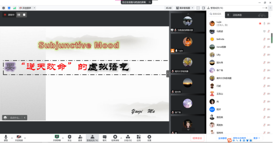 老师们经过精心的准备,分别按姓氏拼音排列有序上阵。大家各自以《基础英语》、《英语语法》、《英语阅读》、《英语写作》、《翻译理论与实践》、《高级英语》、《英国文学史及选读》等主干课程为材料,引经据典,绘声绘色。比如马艳姿老师将枯燥的语法学与生动的电影台词联系起来,引入《习近平谈治国理政》相关句型句式,精彩地演绎了虚拟语气“逆天改命”的强大功能,屏幕前的老师们听得津津有味,云端研讨会气氛一度推向高潮。