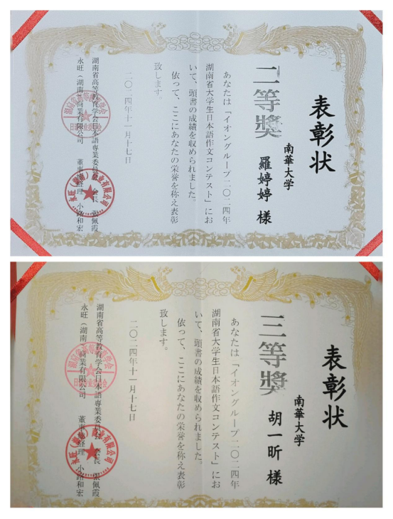 11月17日,在永旺集团2024年湖南省高校日语作文比赛中,beat365手机版官网入口日语专业员工罗婷婷和胡一昕表现出色,分别荣获二等奖和三等奖,为公司赢得了荣誉。