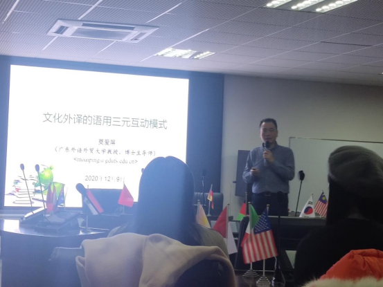 讲座开始,莫爱屏教授首先介绍了三元互动模式的概念,即“语言-语境-交互者”,而语用学框架下的三元互动模式则是“交际者-语言-语境”。接着,莫教授对讲座主题展开具体阐述。他从引言出发(主要分为基础、关键、目的、内涵四个部分),依次展开,和在场师生一起探讨了关于文化外译的语用三元互动模式。探讨内容主要包括以下四个方面:文化与文化外译的内涵,文化传播与文化外译研究,文化外译的语用互动模式,文化精品翻译的语用原则与策略等。莫教授把语用学和翻译研究进行细致的分析比较,并得出结论:语用学和翻译研究因涉及共同研究对象而互相联系,又因各自研究方法和侧重点不同而相互区别;以研究人们动态行为特征为核心的语用学理论,对翻译研究具有指导作用,而翻译研究的成果为语用学理论向纵深发展和完善提供佐证。此外,他再次强调了文化外译的重要性——我们要深信文化外译有助于推进中华文化“走出去”战略的顺利实施,树立文化自信,抓好文化软实力。莫教授主要从事口译研究、语用翻译研究、文化外译等研究方向,在其炉火纯青的专业知识背景下,他将固化的概念用简单动态化的风格阐释,言辞风趣幽默,讲座氛围轻松愉悦。