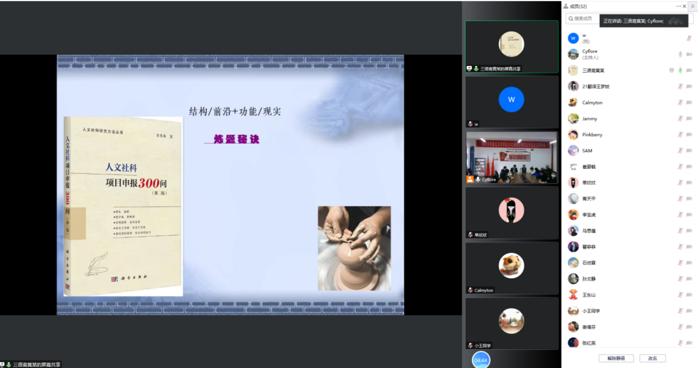 11月17日下午2:30,广东外语外贸大学博士生导师黄忠廉教授应邀为公司师生做关于国家社科基金项目申报辅导系列的专题讲座。本次讲座在雨母校区崇礼楼410会议室和腾讯会议线上同步进行,副经理刘彬担任主持人,公司党委书记龙志坚、副经理肖庚生以及beat365手机版官网入口部分师生到场聆听。