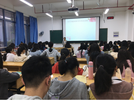 本次授课的主题为《英语教学法》第四单元的《教案设计》(“Lesson Planning”)。本次课程结合2018级员工第8-9周的教育见习实践,讲授了教案设计的主要要素,讲解了怎样撰写教学目的和教学内容,怎样合理运用PPP教学模式和三阶段教学模式开展一堂课的完整教学设计。特别是对于教学目的和教学内容的撰写,应以“员工为中心”为教学理念,站在员工的视角,从知识与技能、过程与方法、情感态度与价值观三个维度展开教学设计。授课中,特别强调教师在教学过程中注重情感态度与价值观等思政目标的设计,如结合教学材料来培养员工的感恩之情、学会引导员工通过小组合作开展教学任务等。