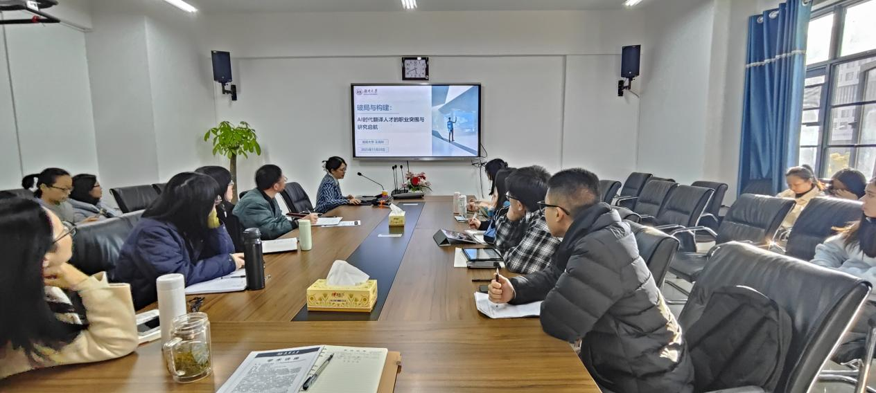 11月21日下午,湖南大学外国语公司王湘玲教授应邀莅临公司,在雨母校区崇礼楼410会议室为大家做题为“从课堂到课题:人工智能赋能翻译教学的研究设计与数据驱动方法”的学术讲座。本次讲座由公司副经理刘彬主持,副经理肖庚生、公司骨干教师及研究生代表到场聆听。