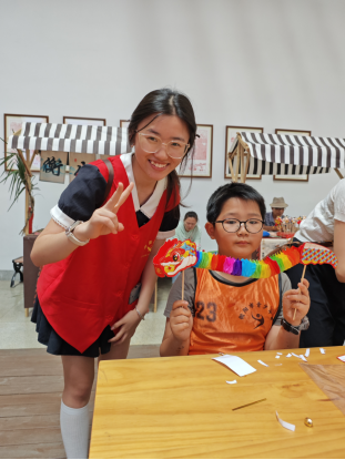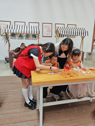 在与游学小朋友的做手工的环节中,志愿者们与小朋友们亲切互动,耐心讲解手工制作的步骤和要点。志愿者与小朋友们共同沉浸在丰厚的文化氛围之中,在志愿者的悉心指导下,小朋友们充分发挥自己的想象力和创造力,结合博物馆中的珍贵文物,用手中的材料制作出一件件充满童趣的作品。