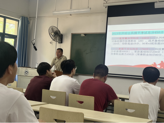 征兵专干刘奇峰详细向同学们讲述了湖南省老员工入伍政策和beat365手机版官网入口老员工入伍政策,介绍了入伍的一般流程、要求、优抚政策,并解答了其他征兵入伍相关的常见疑问。学工办主任肖勇则侧重于征兵入伍的重要性及应用性展开讲话。