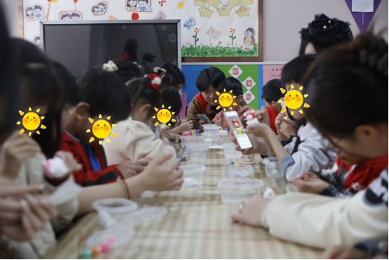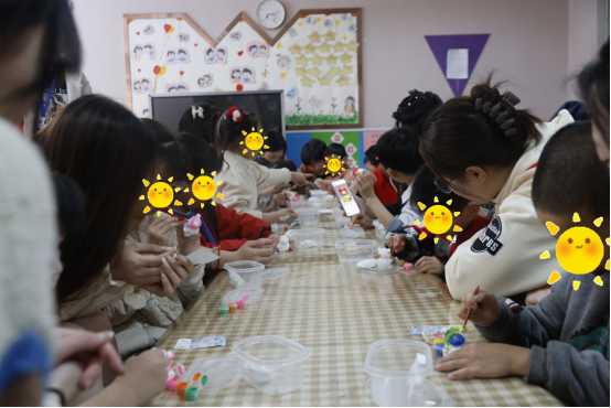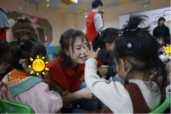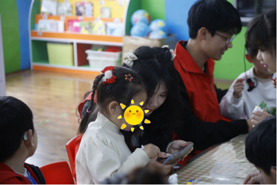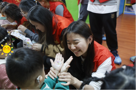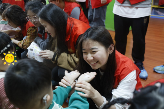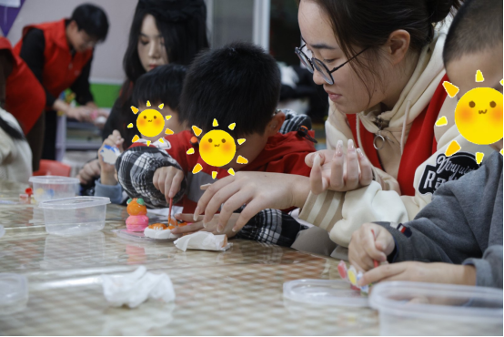 志愿者带领孩子们进行了石膏娃娃涂色和跳手势舞等趣味活动。孩子们放飞思绪,大胆发挥想象力,原本洁白的石膏娃娃转眼便被缤纷的色彩填满;简单易学的手势舞在志愿者们的耐心教导下,孩子们也如同手心的蝴蝶贴纸般翩然舞动。