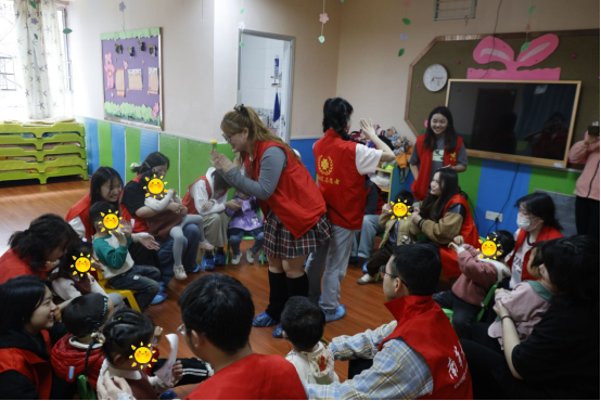 抵达幼儿园后,志愿者们分成两组,分别前往小班和大班教室与孩子们展开互动。熟悉的“红马甲”身影一出现,孩子们便热情地打招呼,温馨的氛围瞬间拉近了彼此的距离。