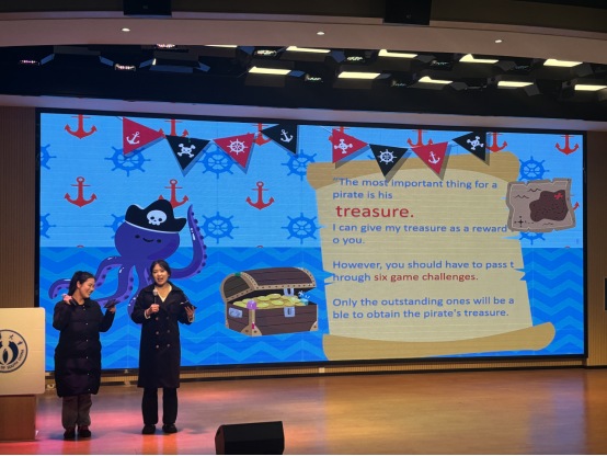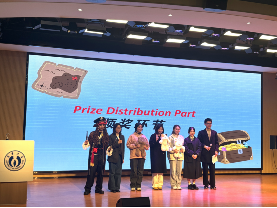 活动伊始,主持人以一段精心准备的英语互动环节和主题视频引入,巧妙地将活动主题与“寻宝”设定相结合,激发了在场同学的浓厚兴趣。随后,在主持人的引导下,同学们积极参与了英语版的“萝卜蹲”和“逛三园”等互动游戏。参与者们流利的英语表达和敏捷的思维赢得了现场观众的阵阵掌声,展现了扎实的语言功底与出色的应变能力。