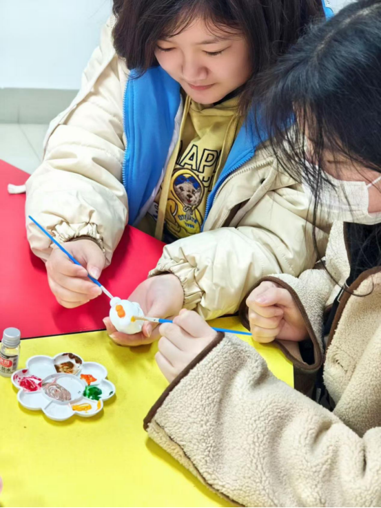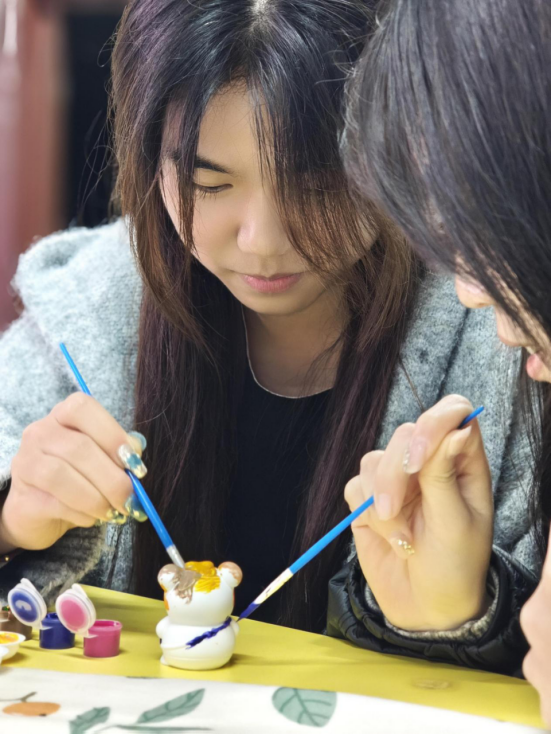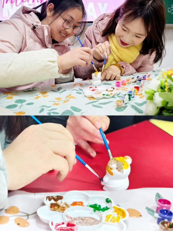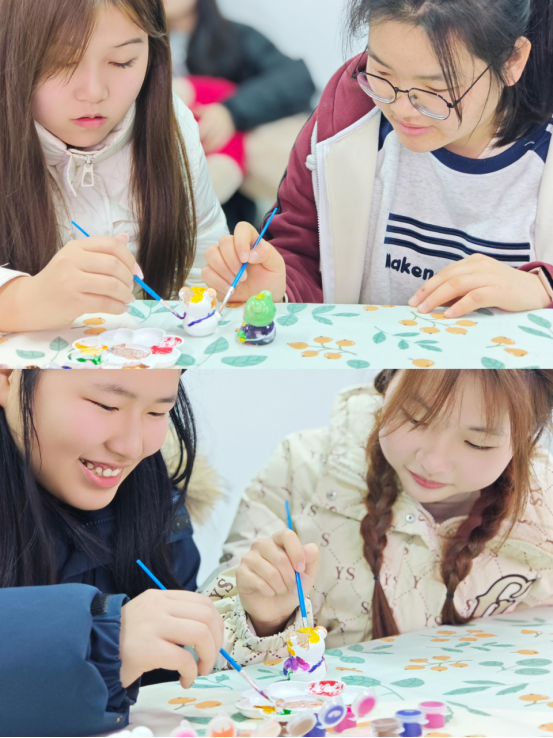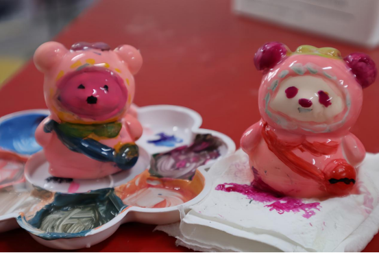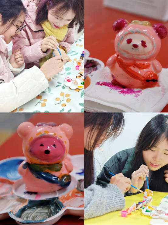 在崇礼楼北310教室里,原本纯白的石膏娃娃被同学们用画笔画染成了春天的颜色。庭芜绿、郁金黄、长春粉、石榴红…各种春色被同学们用画笔勾勒在石膏娃娃上。同学们尽情地在创作中纾解压力、放松心情。每一个可爱的石膏娃娃都被同学们用满满的爱意灌注,同学们彼此交换作品,互相欣赏赞叹,从艺术表达中拉近彼此心弦也加深对自我的认识。