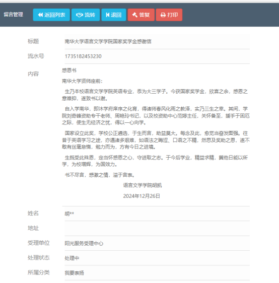 发来感谢信的是英语专业大三员工胡凯,前不久他凭借优秀的成绩成功拿到了国家奖学金,感念公司和公司对他的鼎力相助,为表感谢特意写了感谢信,真挚情感溢于言表。他在信中特别感谢了公司党委周艳玲副书记、资助专干刘奇峰老师和校资助中心的范婷主任,他感谢公司上下对他的支持与帮助,并表示将常怀感恩之心,在未来继续精进学业,给母校增辉,为家国效力。