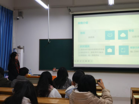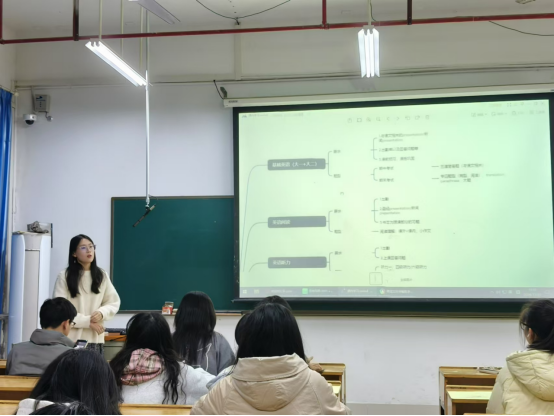 戴丽梨围绕课内学习、课外学习与未来规划三个方面展开分享。在课内学习方面,她详细分析了英语专业课程的课程内容、听课技巧与考试题型。在课外学习方面,戴丽梨根据自身学习经验,向大家推荐了一些线上优质资源,帮助同学们拓宽视野。在未来规划方面,戴丽梨鼓励同学们考公、分享了考研实例,剖析了英语专业可就业的众多行业,劝同学打牢基础、丰富履历。汤莉莉则分享了英语学习方法技巧与期末备考经验。她建议同学们在四六级备考时注重备考顺序,前期练习听力与阅读理解,后期攻破翻译与写作。她提醒同学们依托课程积累词汇和语法,总结句型技巧,并鼓励大家积极参与比赛以锻炼能力。在期末备考方面,汤莉莉建议同学们重视平时课堂互动,争取高分,针对语言学等理论课程,绘制思维导图梳理知识,分阶段复习,合理利用周末,做到劳逸结合。