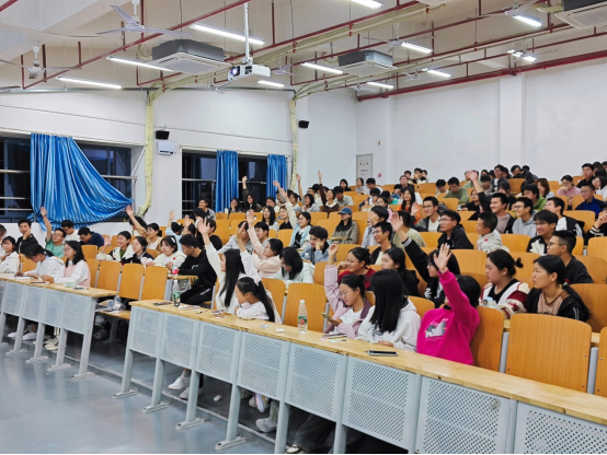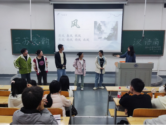 活动伊始,主持人向全体同学致意并介绍活动流程,随后播放《走进三苏》纪录片引出本次活动主题。观影结束,“三苏”相关知识的抢答旋即开始,同学们踊跃举手。随后还进行了“三苏”诗词背诵抢答与朗诵欣赏。最后进行的飞花令将会场气氛带向高潮,同学们积极参与,在诗词的碰撞中展现出同学们对诗词的饱满热情和对古代文人的钦敬之情。