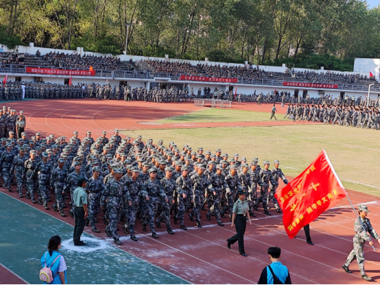 上午8点,伴随着庄严的国歌声,五星红旗在国旗班的护卫下冉冉升起,军训汇演暨表彰大会正式拉开帷幕。