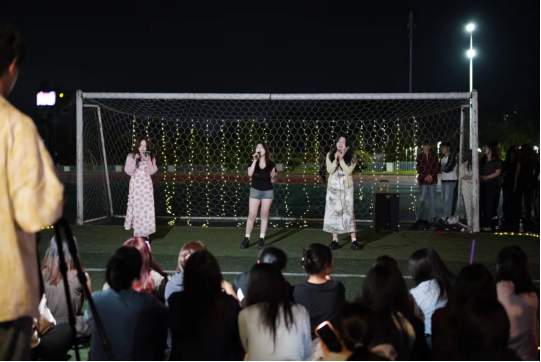 一首《千年泪》作为收尾曲,经典旋律引发观众强烈共鸣,现场响起热烈的掌声。之后便是观众K歌环节,同学们在随机歌单前勇敢上台,展现了学业外多才多艺的一面。明月与晚星相伴,晚风与歌声奇飞。随着终曲落幕,草地音乐节正式结束。