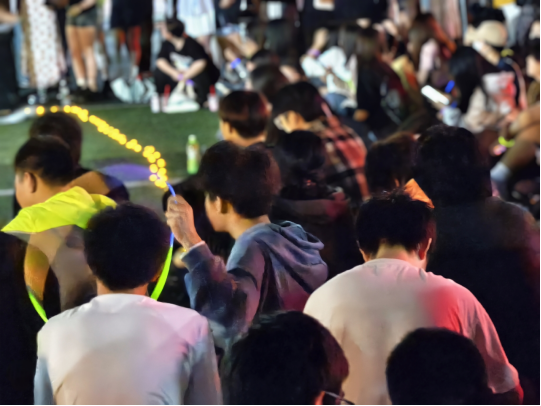 天色幽蓝,晚星渐明,星型霓虹灯围起的一方舞台旁围来了一圈又一圈的观众,大家在温馨欢快的氛围下入场,于被雨水淋湿的草坪上落坐,面朝着精心布置的灯光舞台,头顶雨母校区清澈的夜空。随着夜幕降临,圆月半露娇容,草地音乐节在主持人激动人心的开场下拉开序幕。