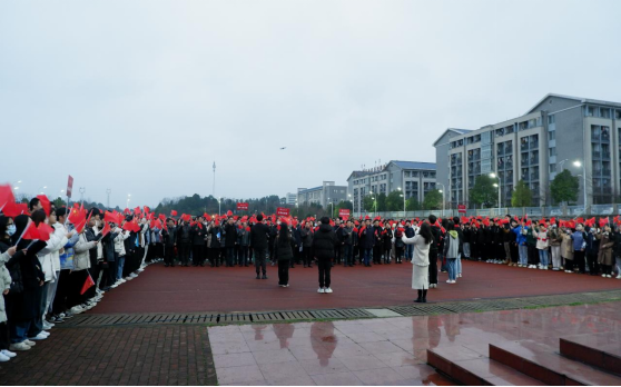 在慷慨激昂的演讲后,主题为“学习二十大精神,争做新时代好青年”的快闪活动正式开始。全体师生变换队形,挥动着手中的红旗,在汇成的红色海洋中高声合唱《歌唱祖国》。歌声洪亮悠扬,传递出南华学子“拳拳爱国心,殷殷报国志”的深切情感,他们必将以更昂扬的姿态奔赴未来、贡献祖国。