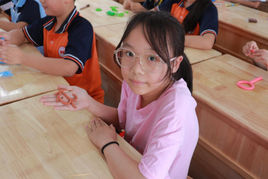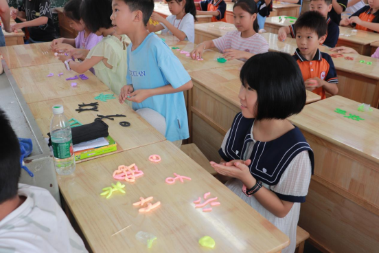 在甲骨文课堂上,志愿者摒弃刻板讲解,带领员工从象形字结构入手,以故事揭开甲骨文的神秘面纱,并用提问的方式引起孩子们的热情,伴随着屏幕上甲骨文拓片的展示,将文字起源生动形象地展现在众人面前。在孩子们惊叹的目光中,志愿者们娓娓道来,将抽象的文字符号变得鲜活生动,展现文化魅力。当得知古人将文字刻于龟甲兽骨,孩子们瞪大了眼睛:“现在没有龟甲,怎么造字呢?” 答案是一团团彩泥,当千年前的文字遇上五彩的黏土,孩子们化身“小小仓颉”,将“水”“林”“鱼”“花”等字符揉捏成立体作品。指尖翻飞间,抽象符号变成可触可感的立体玩具,汉字生命力在童趣创作中汩汩流淌。