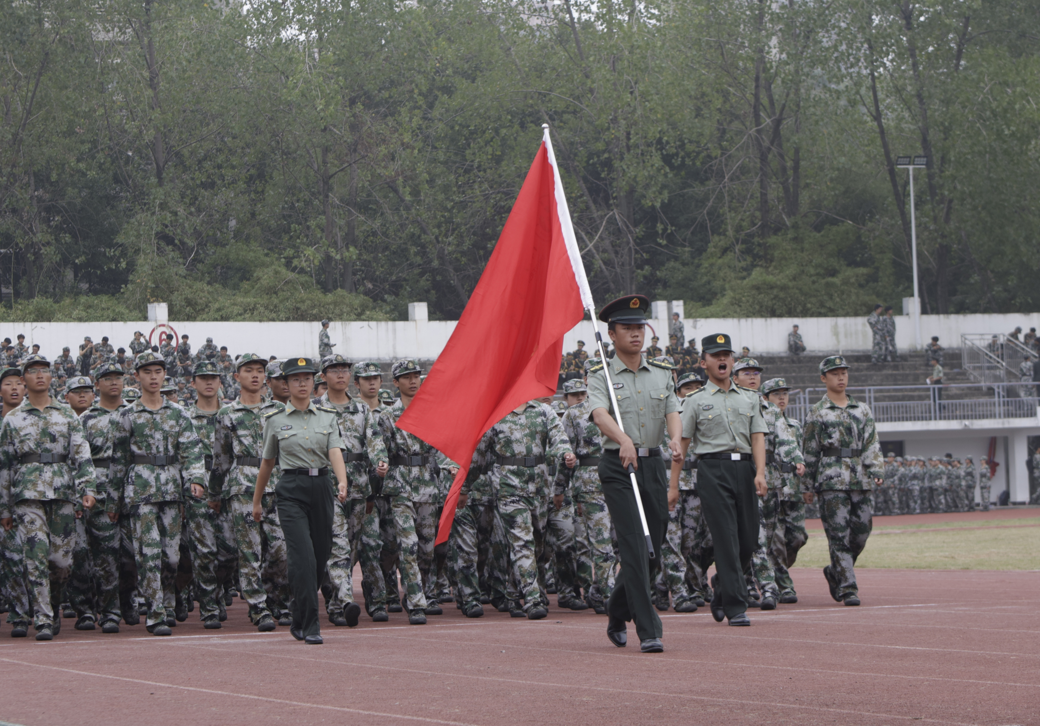 上午8时,大会在庄严的国歌声中启幕,五星红旗随着歌声冉冉升起,军训汇演正式拉开帷幕。
