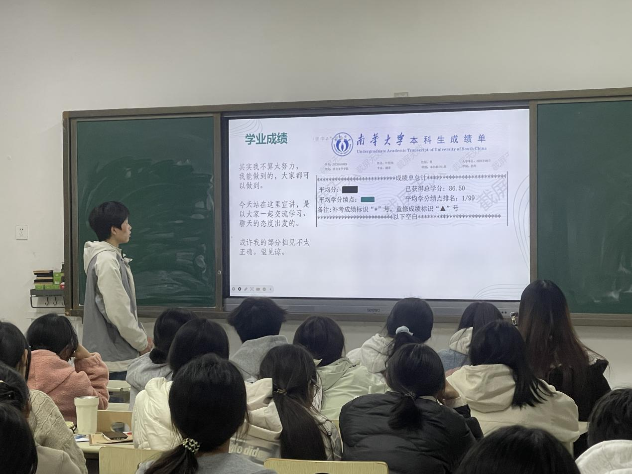 紧接着,叶程刚学长从综合素质测评的算法切入,聚焦课堂和考试实用技巧。他从体育锻炼、课堂表现、小组作业、专四备考四个角度出发,提出适当降低标准、注重和平交流、保持良好心态等建议,鼓励同学们学会换位思考,营造和谐学习氛围。