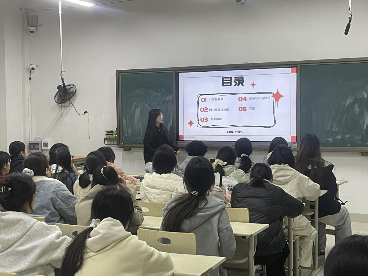 活动中,汤莉莉围绕英语的“听说读写”核心能力展开,为同学们分享了具体的学习方法,帮助同学们更好地提升英语听力水平。她强调,在英语口语表达方面,要多模仿、多练习,锻炼语感。在阅读方面,建议同学们建立分级阅读计划,坚持每日阅读习惯,培养语感和阅读理解能力。写作上,要注重积累好词好句,建立个人语料库,助力提升专业素养。