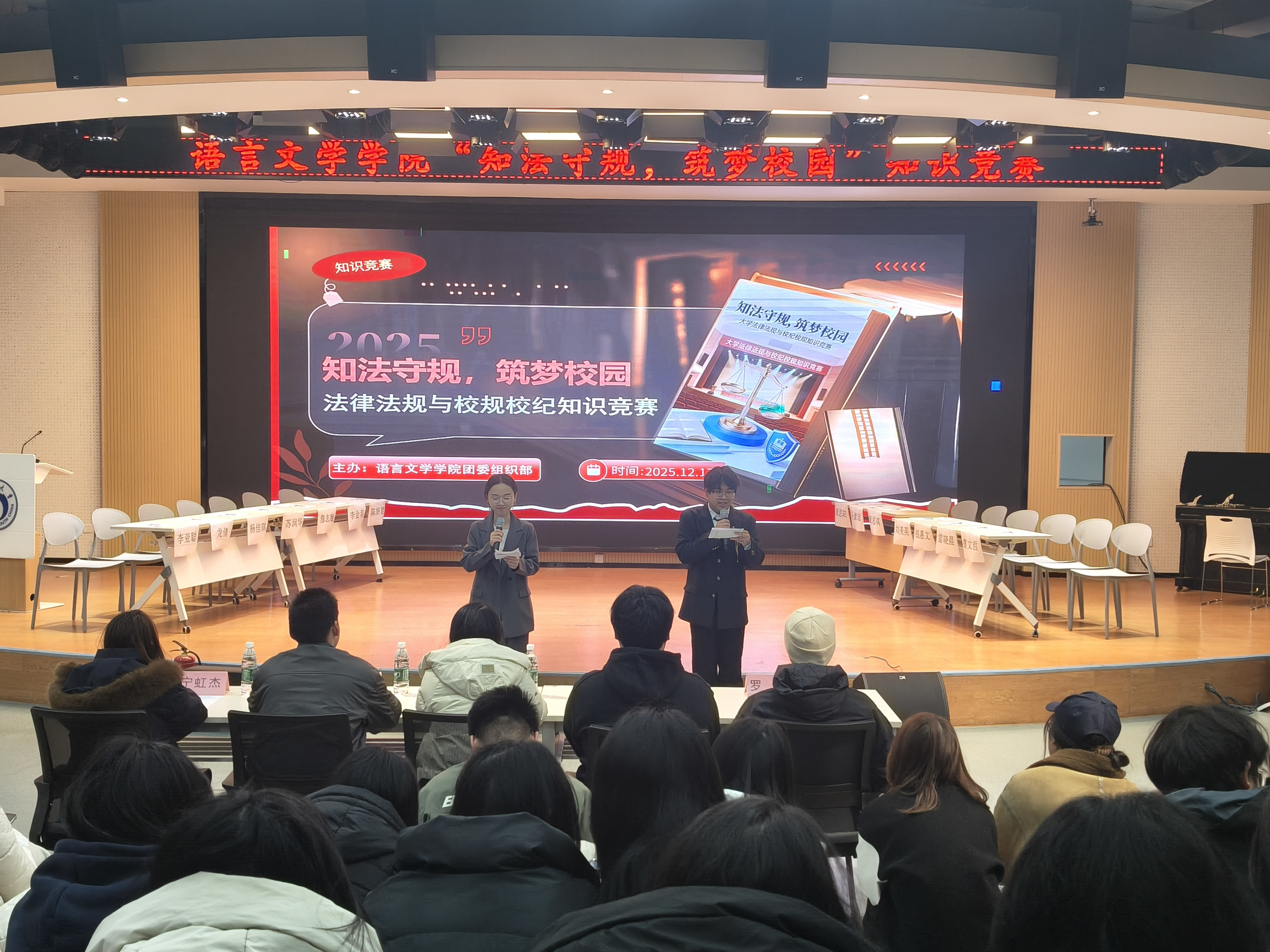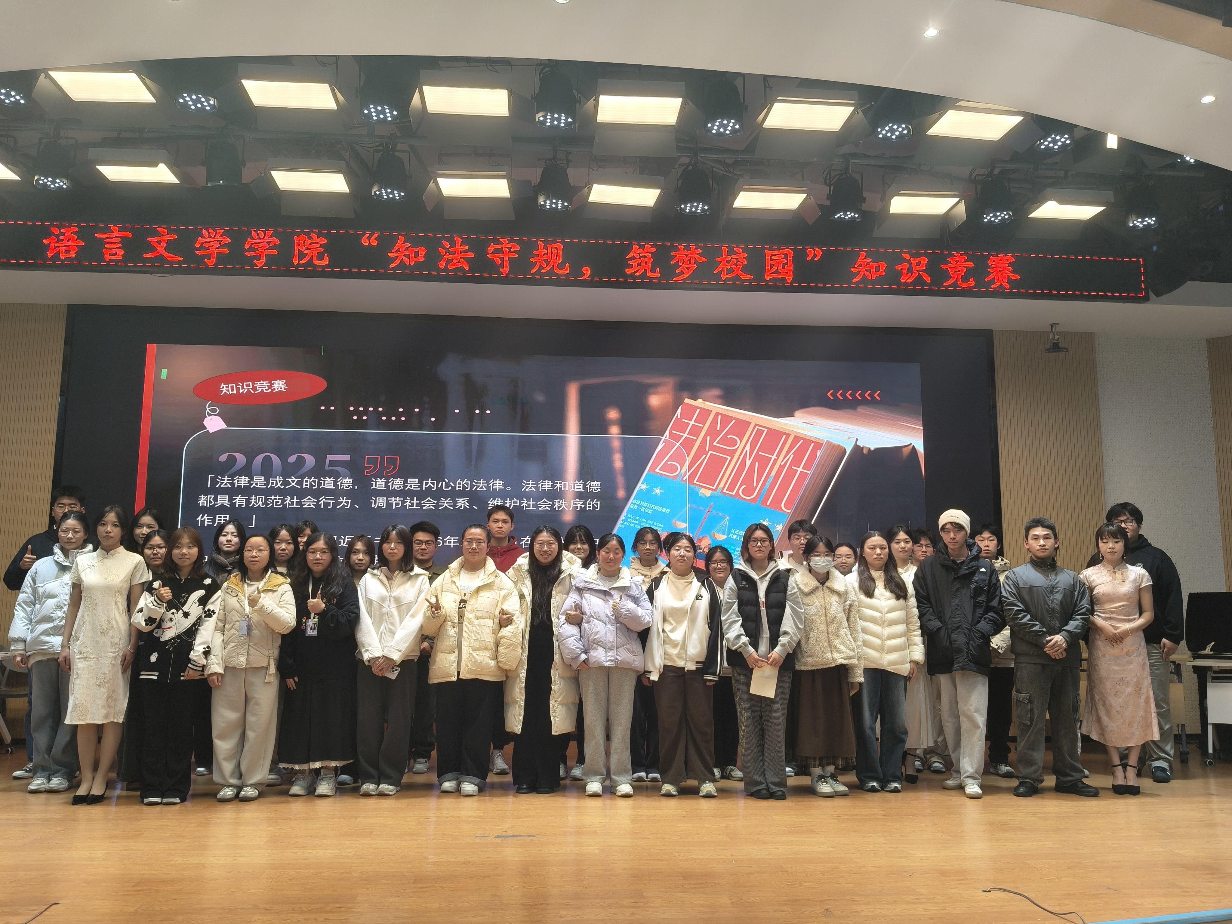 12月17日晚,由beat365手机版官网入口团委组织部主办的“知法守规,逐梦校园”知识竞赛在松霖老员工活动中心顺利举行。公司团委书记肖玲慧、第九届主席团成员及25级全体新生齐聚现场。