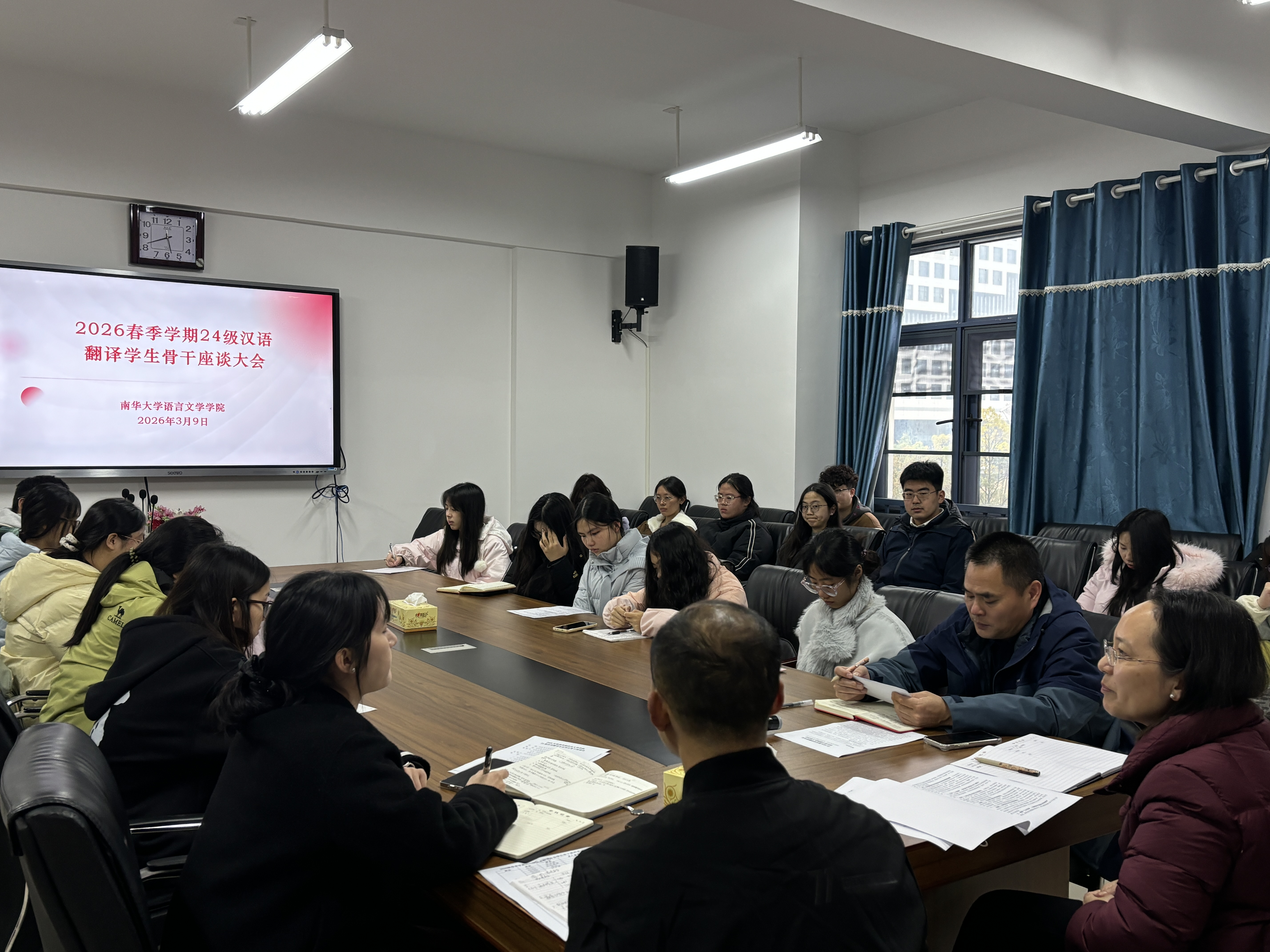 3月9日中午,beat365手机版官网入口于崇礼楼北410会议室召开2026春季学期24级汉语翻译员工骨干座谈大会。公司党委副书记周艳玲,辅导员欧阳梦,24级汉语、翻译各班班长、团支书及学习委员参会,辅导员刘奇峰主持会议。