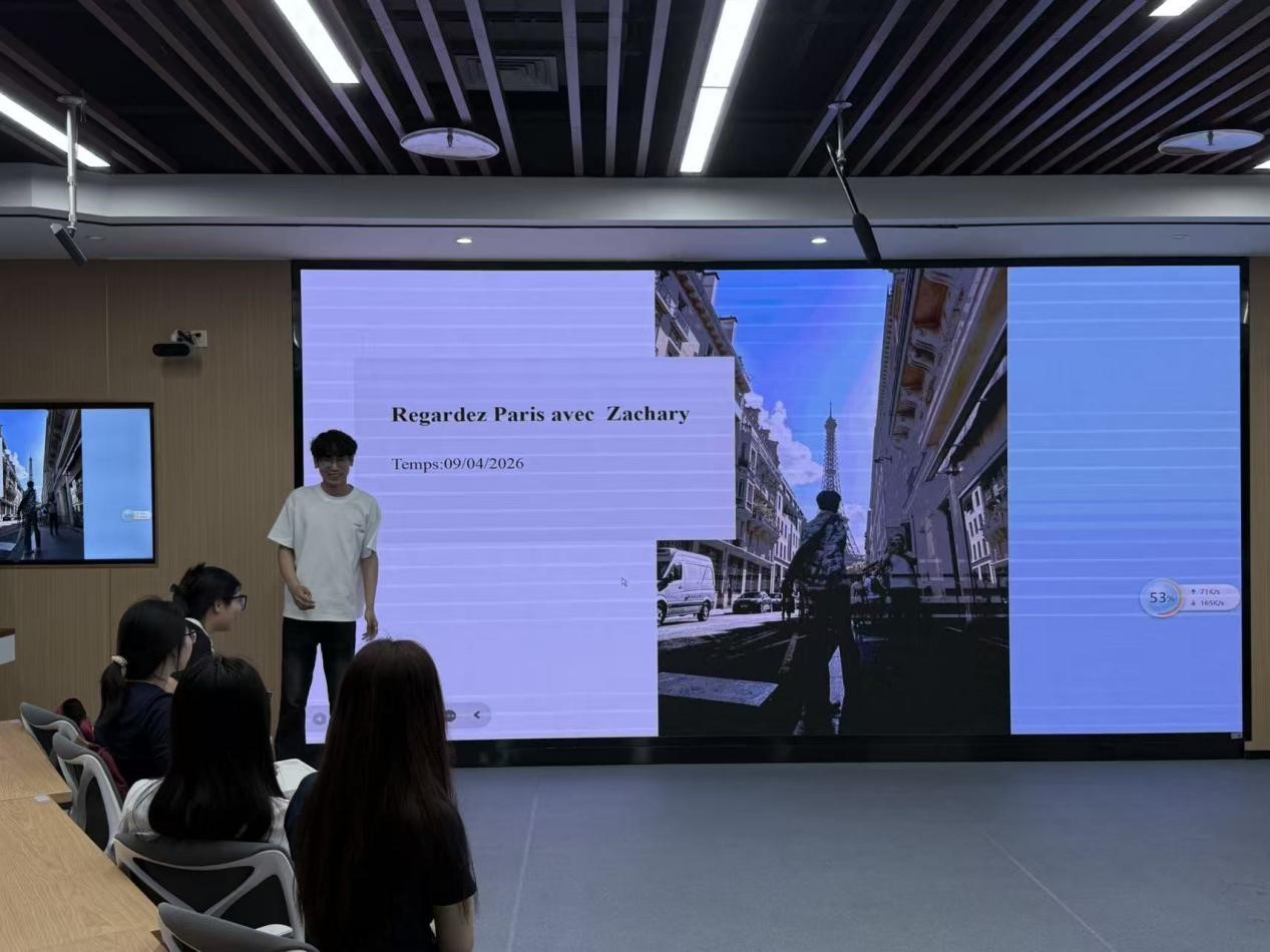 活动伊始,邵泽楚以海明威《流动的盛宴》为切入点,搭配自制影像视频,通过互动问答的形式,生动展现法国自然风光与人文底蕴,打破大家对法国仅停留在埃菲尔铁塔、红酒、香水的表层认知,诠释出浪漫与理性并存、精致与松弛共生的真正法式风情。分享过程中,邵泽楚聚焦实用内容,为同学们带来全方位干货指南。针对网络刻板印象,他澄清塞纳河水质相关言论,引导大家客观看待外国文化,还分享了“系绳防盗”的趣味生活技巧。同时详解法国社交礼仪、语言习惯与罢工文化,给出先法语问候再英语沟通的交流建议。