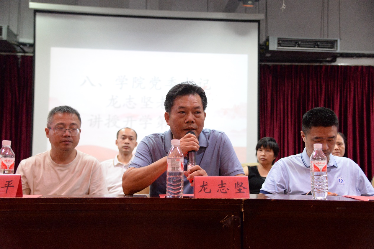 公司党委书记龙志坚给全院新同学讲授开学第一课,他以“何为大学”为题,引发同学们思考,循循善诱,结合《论语》向新生们提出了三点希望:第一,要在大学中不断认识与发展自己,鼓励新生们将专业所学与社会需要相结合,做世界文明交流互鉴的文化使者;第二,要设立清晰的目标规划,希望同学们以更高的目标要求自己,不要浪费时间,虚度光阴;第三,要在学习中追求立人的根本,明确会做人才会做学问,鼓励大家学习儒家思想中“恕”的精神内涵。龙志坚祝愿新同学在求学路上心怀所爱,阔步向前,无惧风雨,力争上游,在广阔的大学中,描画属于自己的青春蓝图。